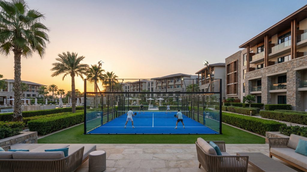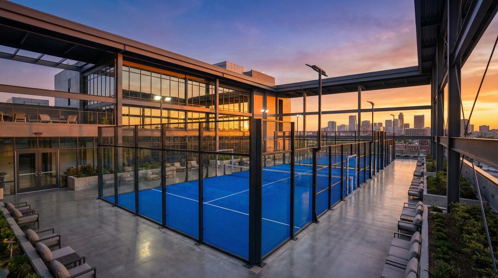 A standard padel court measures 10 meters wide by 20 meters long and is divided by a net in the center. Modern design emphasizes visibility, often utilizing “panoramic” back walls that remove vertical pillars to provide an unobstructed view for spectators.