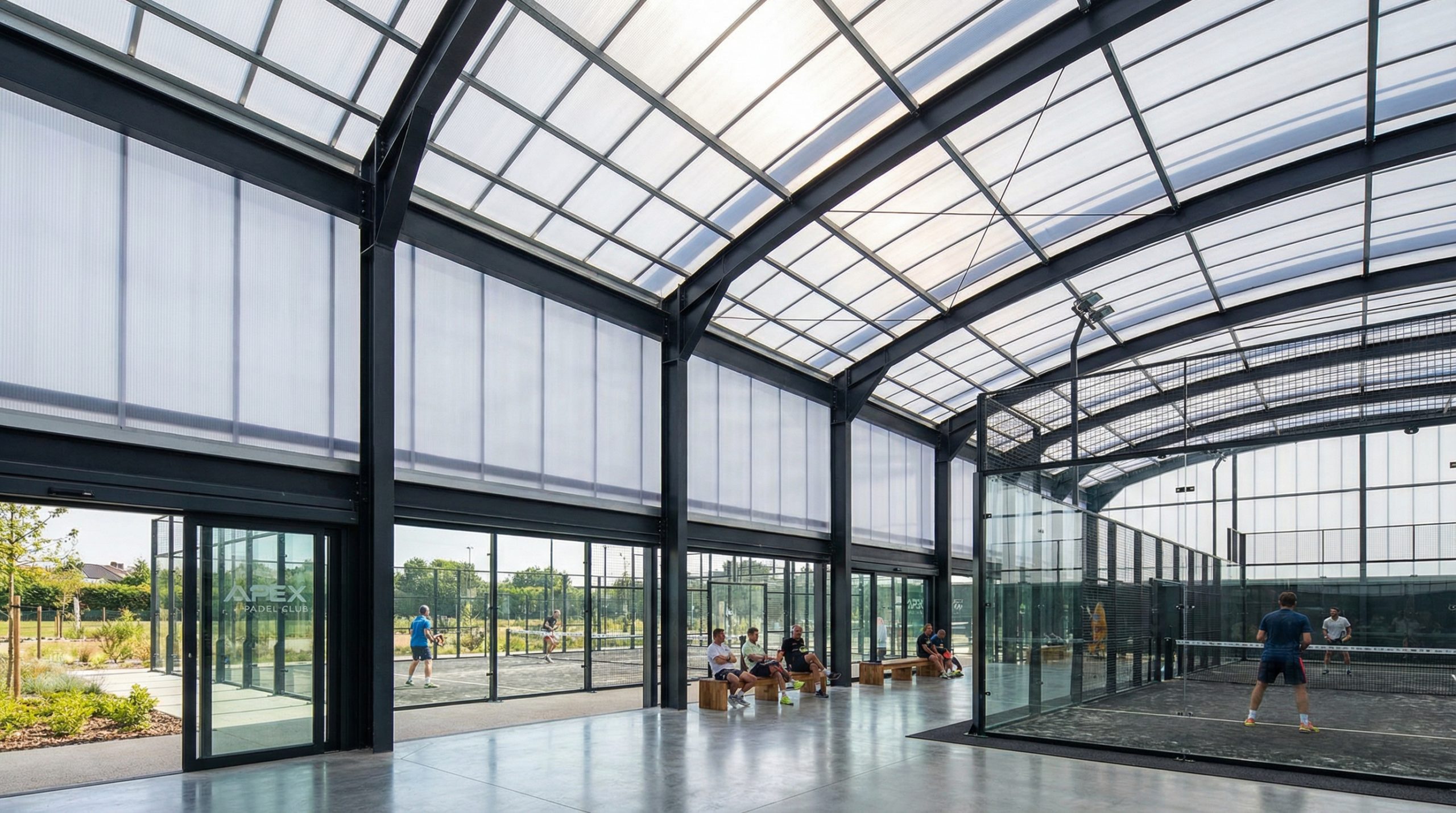 - The Court Structure (40-50%): Steel frame, glass, and mesh.