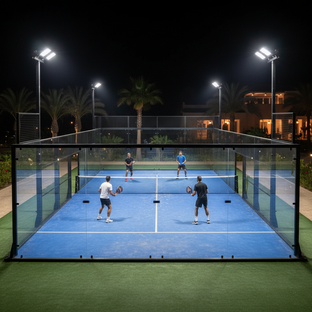 Proper LED lighting on a padel tennis court ensures uniform visibility for high-speed play without blinding the players during lobs and smashes. The standard requires at least 4 floodlights per court, mounted at a height of 6 meters or more.