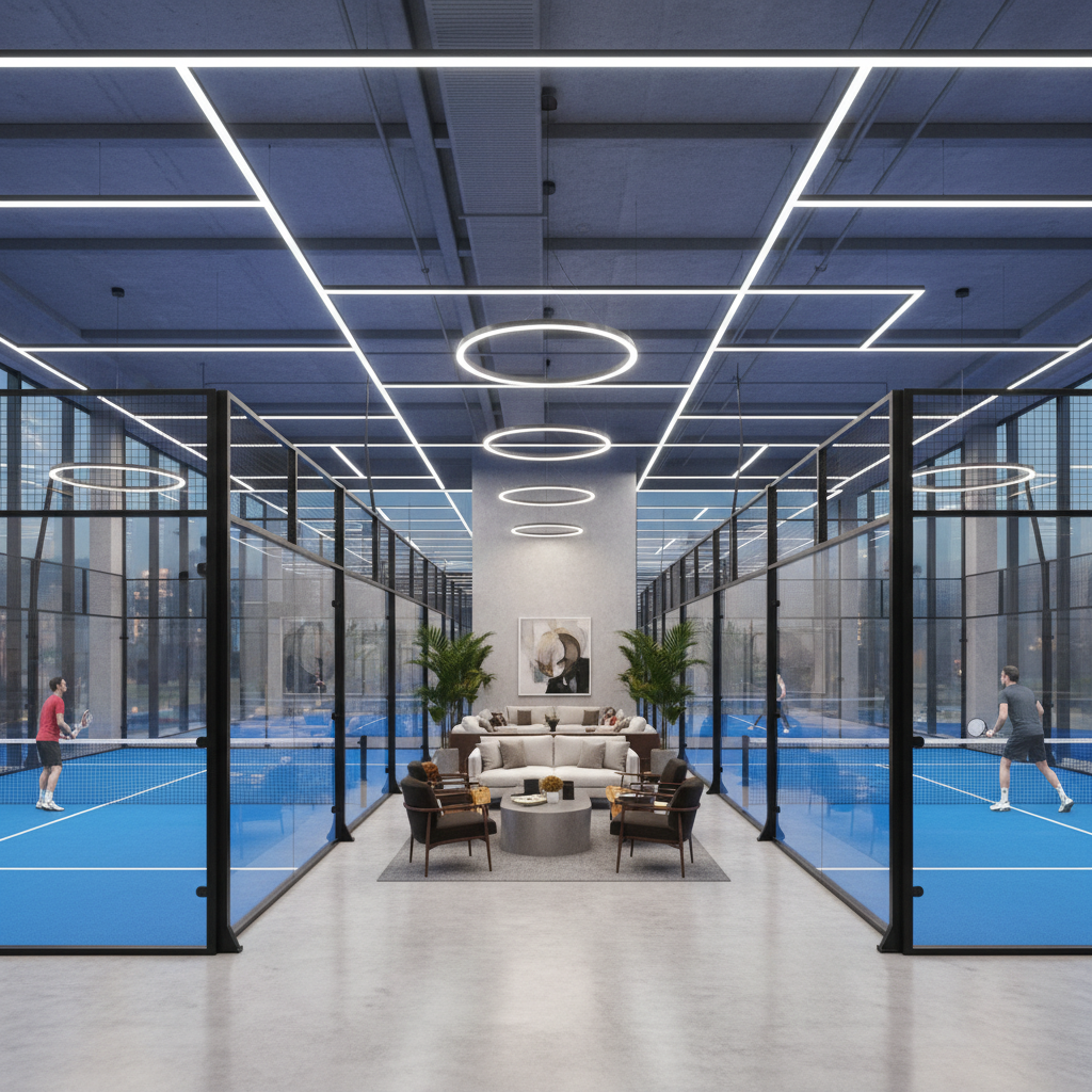 An indoor padel haus needs a flicker-free LED lighting system that provides at least 500 lux of uniform illumination across the entire court surface. This lighting must be asymmetric to ensure that players are never blinded when looking up for high lobs or overhead smashes.