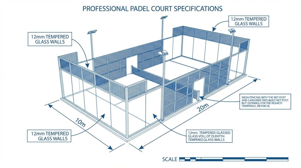 Standard specifications demand 10m x 20m internal dimensions, galvanized steel frames, and 10-12mm thick tempered glass panels. When planning your padel san diego project, adhering to these international dimensions is the first step toward building a competition-ready venue.