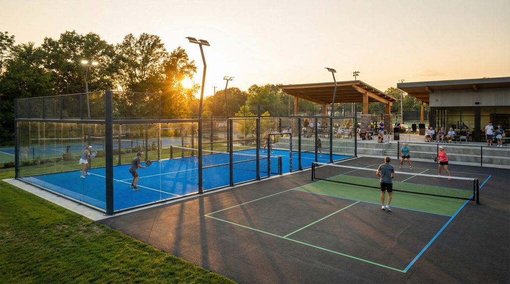 - Lighting: Padel requires integrated 6-meter poles; pickleball uses standard court lights.