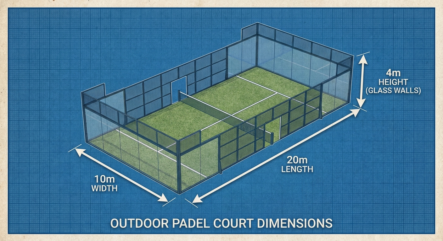 You need a minimum footprint of 20×10 meters for the playing area, plus a small perimeter for the structure and player movement. An outdoor padel court occupies much less space than a tennis court, allowing you to double your player capacity on the same land. Precise measurement during the planning phase prevents costly errors during foundation pouring.