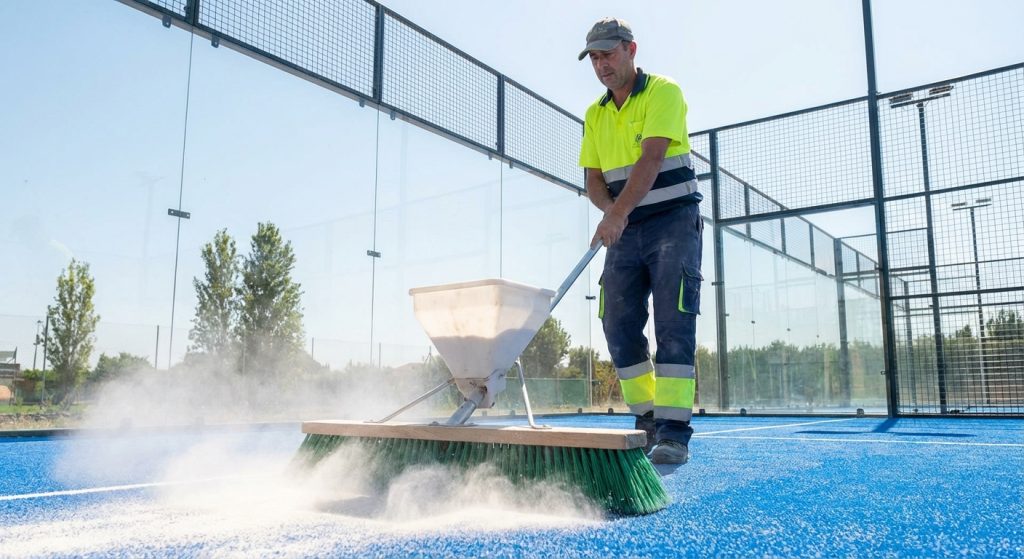 Surface installation in padel court construction involves laying high-density synthetic turf over a porous concrete or asphalt sub-base. Specialized padel court construction uses fibrillated or monofilament grass that is UV-stabilized for long-term outdoor performance. This surface is then filled with specific amounts of kiln-dried silica sand to provide the necessary grip and ball bounce characteristics.