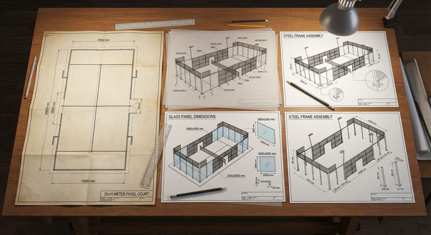 A regulation court is exactly 20 meters long and 10 meters wide, divided by a net at the center. You must ensure the base slab is slightly larger to accommodate the glass supports and lighting columns.