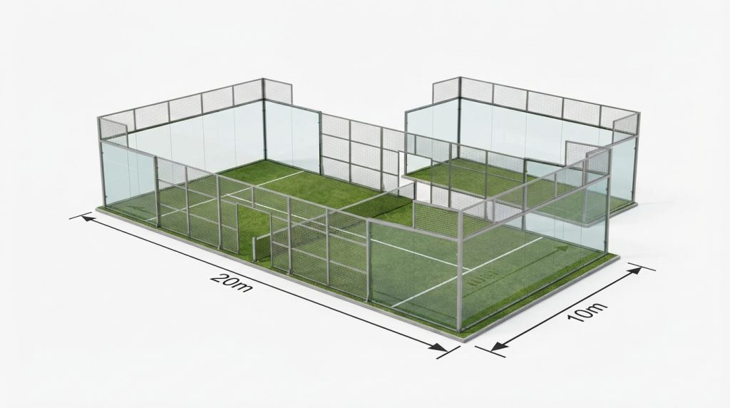 The wall structure is engineered specifically to surround the 200-square-meter playing surface while allowing for required rebound physics. Modern enclosure systems must fit the padel tennis court dimensions perfectly to ensure the glass panels and mesh are flush with the playing area.