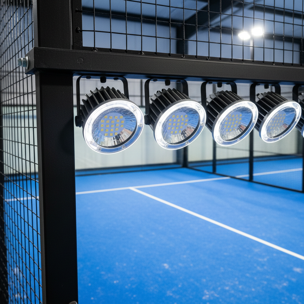 Lighting is critical for indoor padel because players must track fast-moving balls in confined spaces. You should install LED floodlights that provide at least 500 to 750 lux. Correct placement eliminates distracting shadows on the glass and floor surfaces.