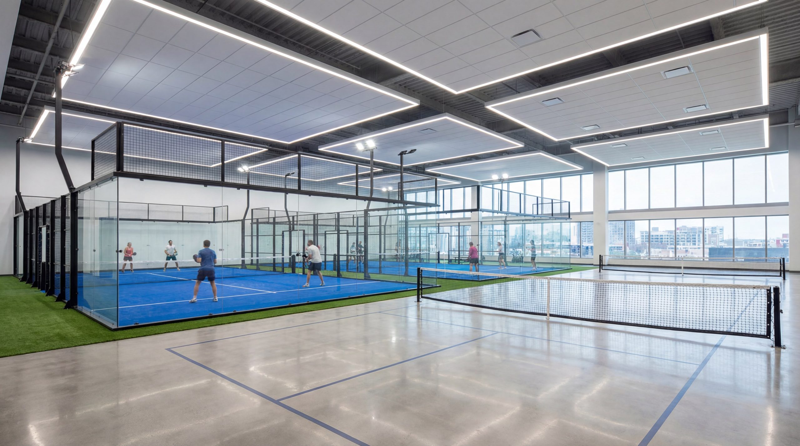 - Verticality: Padel requires at least 6 meters of clear height for indoor play to accommodate high lobs.