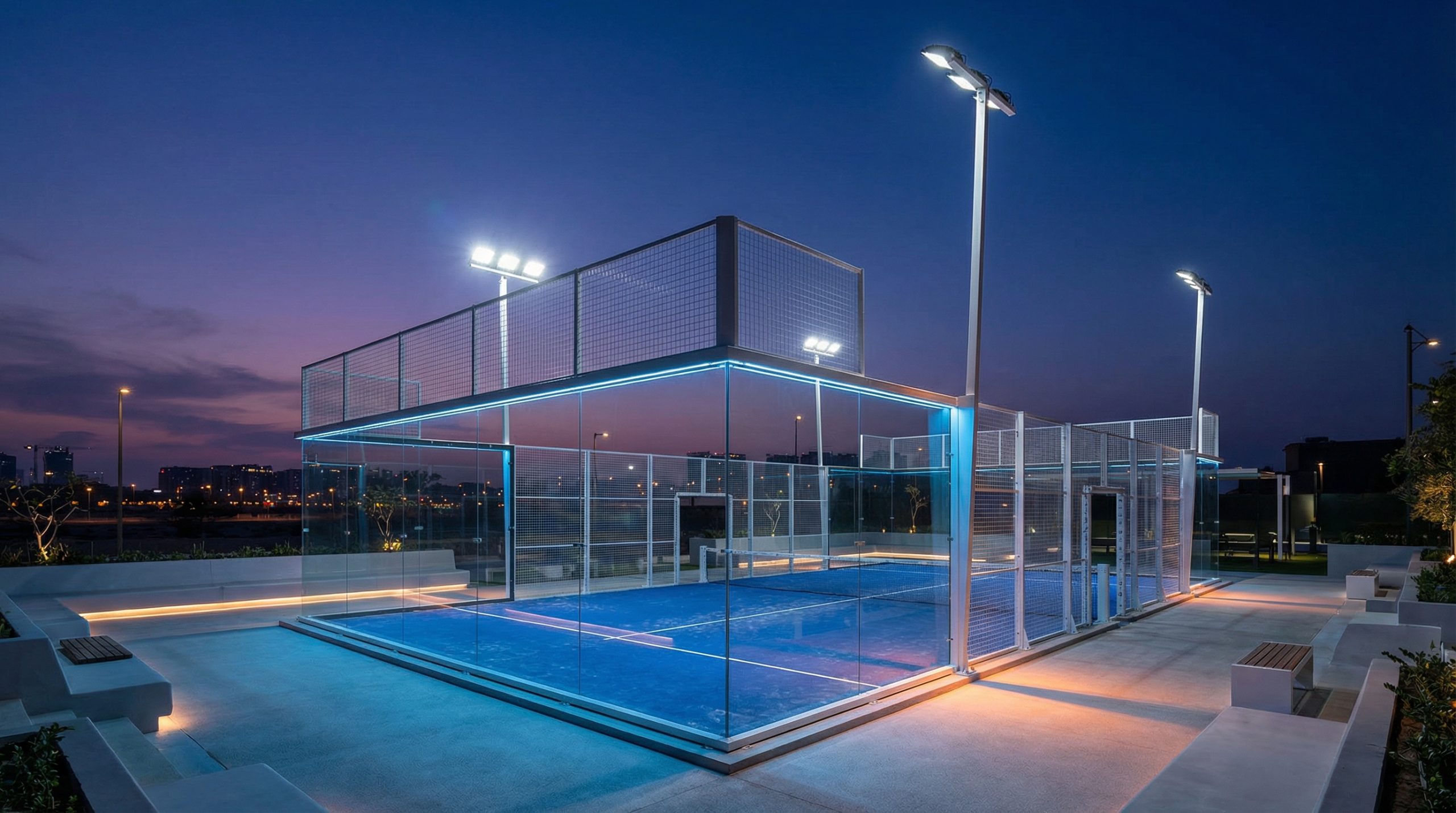 The lighting system for a panoramic padel court must be as advanced as the structure itself to avoid creating glare on the expansive glass walls. You should prioritize LED systems with asymmetric lenses that direct light onto the turf rather than scattering it towards the spectators or players’ eyes. Proper lighting not only extends your booking hours but also enhances the premium visual appeal of the court at night.