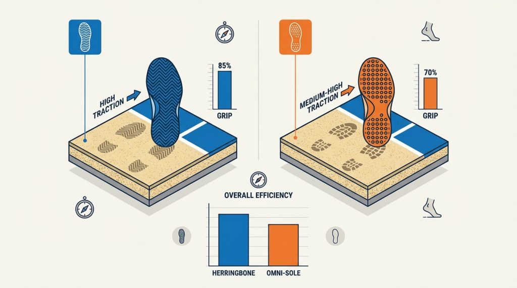 Yes, because the sand acts as a layer that reduces friction between your shoe and the carpet. On these surfaces, a deep herringbone sole is non-negotiable if you want to avoid slipping during a serve or a quick turn.